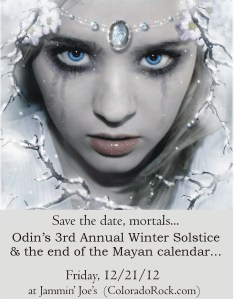 Save the date: 12/21/12. The end of the Mayan calendar, and the beginning for a new age of artists. Odin’s 3rd Annual Winter Solstice will take place at Jammin’ Joe’s in Arvada (Ralston and 58th Ave) – a rock concert and masquerade ball. Admission is free if ye show up in costume.