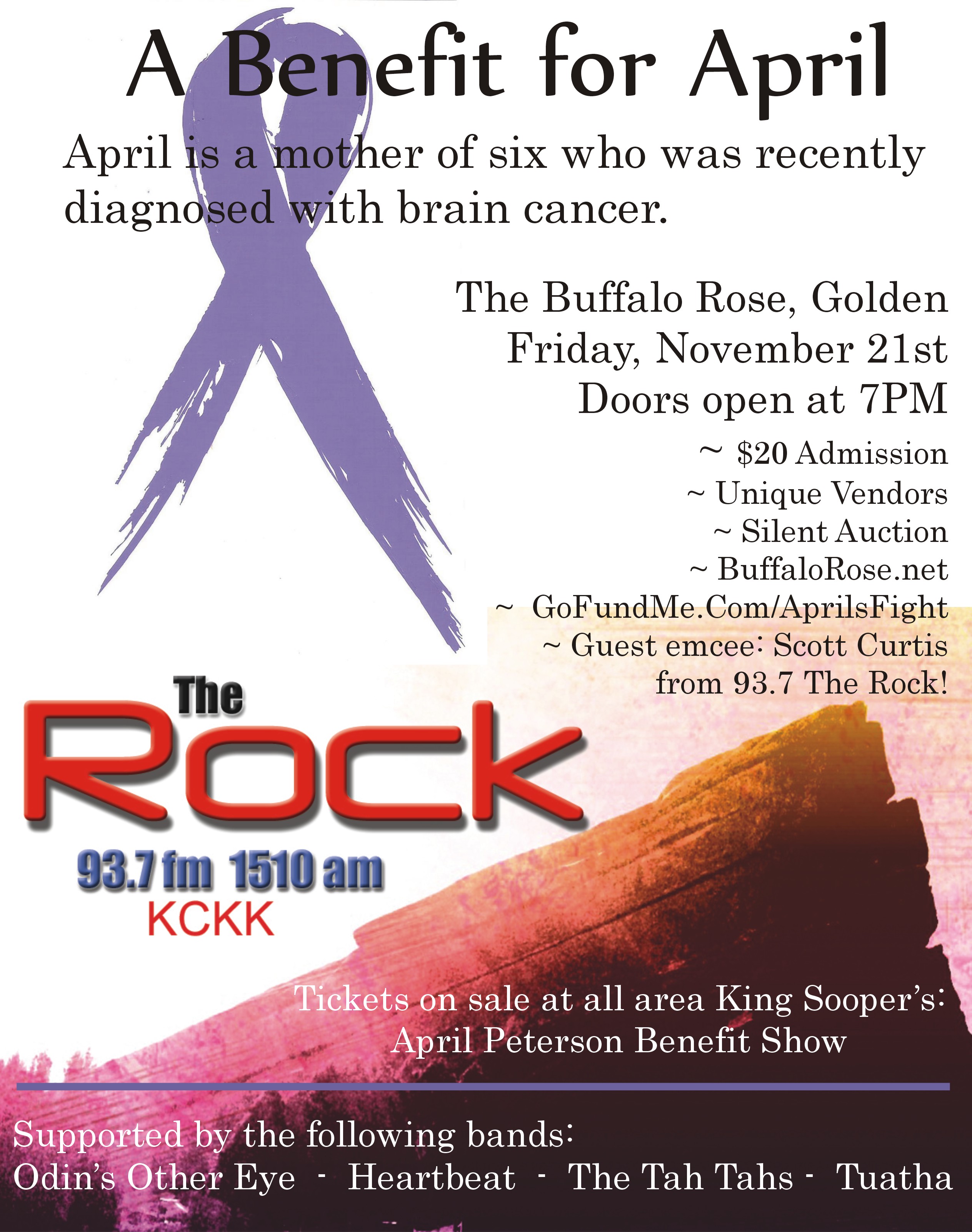 Please join us this Friday, November 21st, for a special show at the Buffalo Rose in Golden. This is a benefit for April Peterson, a mother of six that was recently diagnosed with brain cancer. Doors open at 7PM and admission is $20. Tickets are also available at all area King Soopers under April Peterson Benefit Show.