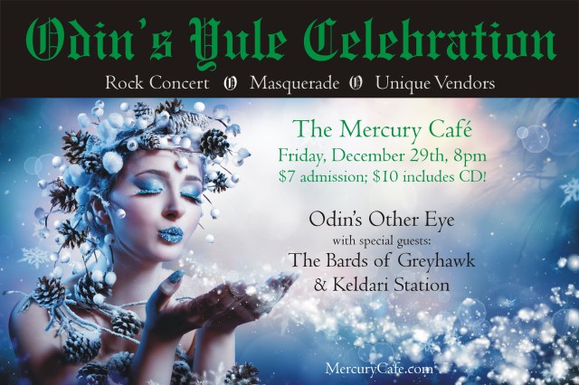 Odin’s Yule Celebration at the Mercury Cafe On December 15, 2017November 16, 2018 By MarcIn Odin's Yule Celebration, Special Events Odin’s Other Eye returns to the Mercury Cafe for a special winter celebration. Odin will be accompanied by The Bards of Greyhawk and Keldari Station. Doors open at 7:30pm. Please join us! Share this: Click to share on X (Opens in new window) X Click to share on Facebook (Opens in new window) Facebook Like Loading... Related